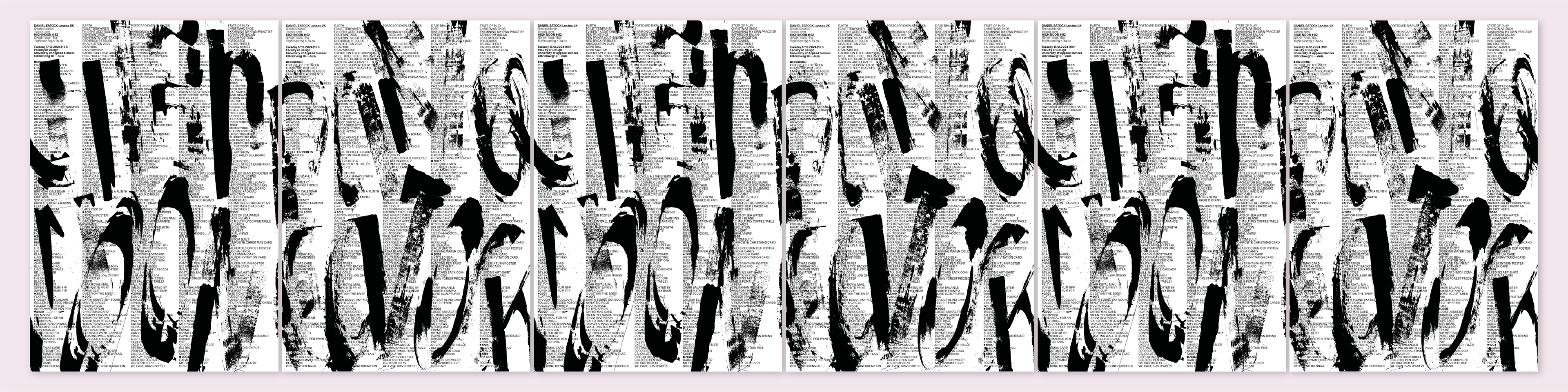 Der erste Entwurf bestand aus zwei Ebenen: Einer rein informellen Typografie-Ebene, die alle von Daniel Eatock gestalteten und veröffentlichten Arbeiten beinhaltete, und einer zweiten Ebene, die inspiriert von Eatocks Rolling Pin Paintings seinen Namen und „High Noon“ in einer handgemalten Schriftart mit Spachtel und Farbrolle als Überdruck darstellte.